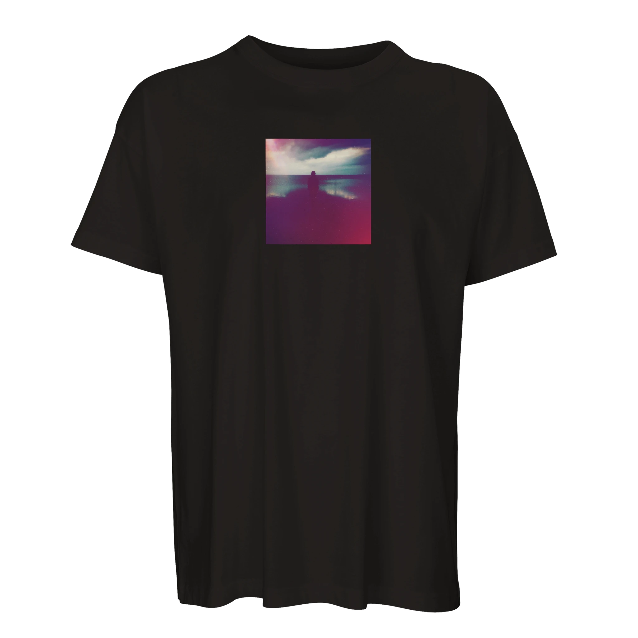 A figure stands at the horizon’s edge, where sea and sky dissolve into violet and deep indigo.